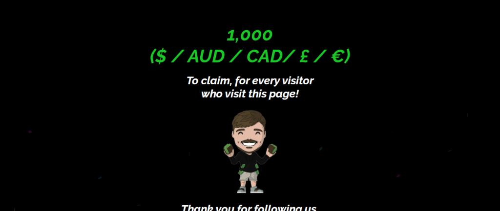 The grammar on the page is incorrect and the title is just “US Giveaway,”. When you visit the page, you can see a picture of Mr Beast welcoming you to the website, it then goes ahead to list steps you have to take in order to claim the $1000 reward. These steps include: