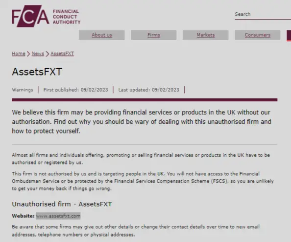 First of, Assetsfxt.com has drawn the attention of the Financial Conduct Authority (FCA). Upon checking the FCA, UK registry, we find a warning that the broker is being illegally represented for a domain managed by this licensed company: