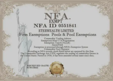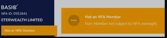 The NFA register shows that although there is a company called Eterwealth Limited it is not a member of the NFA and is not subject to NFA oversight. This company is only registered with exemptions for commodity pool operator and commodity trading advisor, which prevents it from providing financial services in the US.
