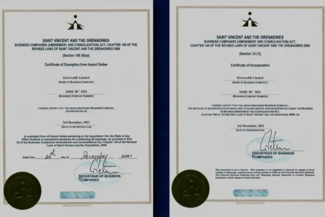 First of, EterWealth FX openly presents images of certificates of incorporation in the Saint Vincent and the Grenadines (SVG) offshore zone in the name of Eterwealth Limited.