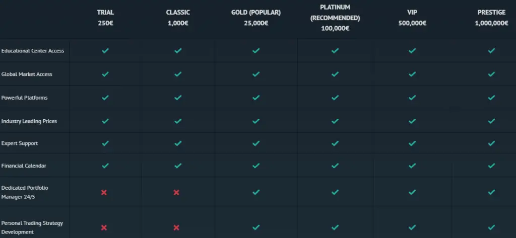 FinTech Platform offers different account types such as Trial, Classic, Gold, Platinum, VIP and Prestige. According to the account descriptions, the maximum leverage reaches 1:200 and a pip of 0.4.