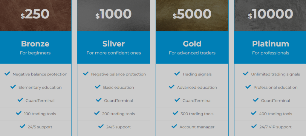 GuardCapital FX offers variety of trading account for clients like Bronze, Silver, Gold and Platinum. According to the website, the broker leverage is capped 1:100 and a spread of 3 pips.