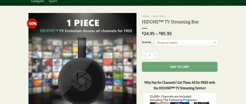 The Hidone Streaming Device scam uses viral social media ads and websites with impossible claims of accessing all TV channels for free to promote $5 streaming sticks from China at insane 1000%+ markups as incredible cable streaming devices.