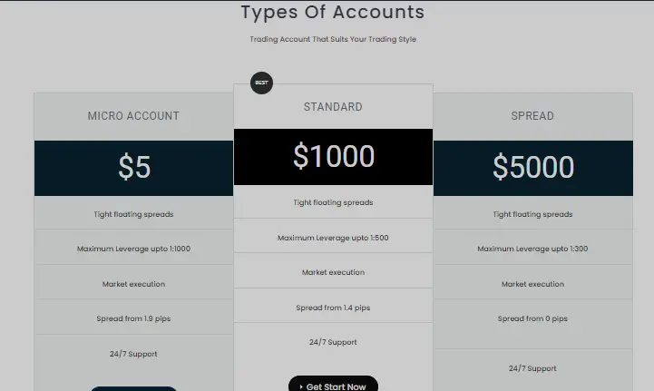 The broker offers different trading account for clients. According to the website, it offers a maximum leverage of 1:1000 and a spread of 1.9 pips.