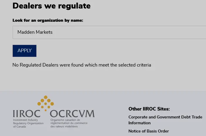 But Madden Markets Limited is not among the brokers authorized by the Investment Industry Regulatory Organization of Canada (IIROC).