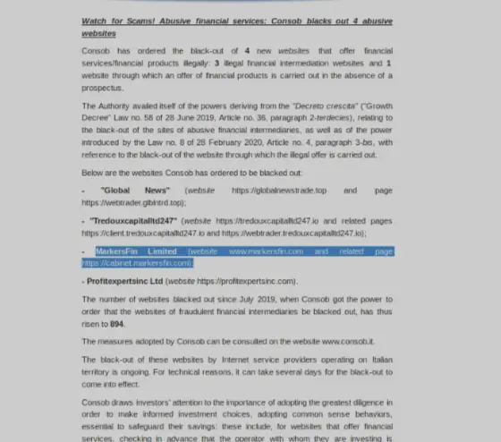 The situation always gets worsen for unlicensed brokers when some institutions issue a warning against them. Another financial authority CONSOB has blacklisted the broker for public to see.