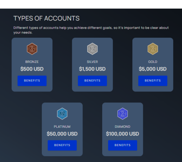 Millennium Operations offers different account types such as Bronze, Silver, Gold, Platinuim and Diamond.