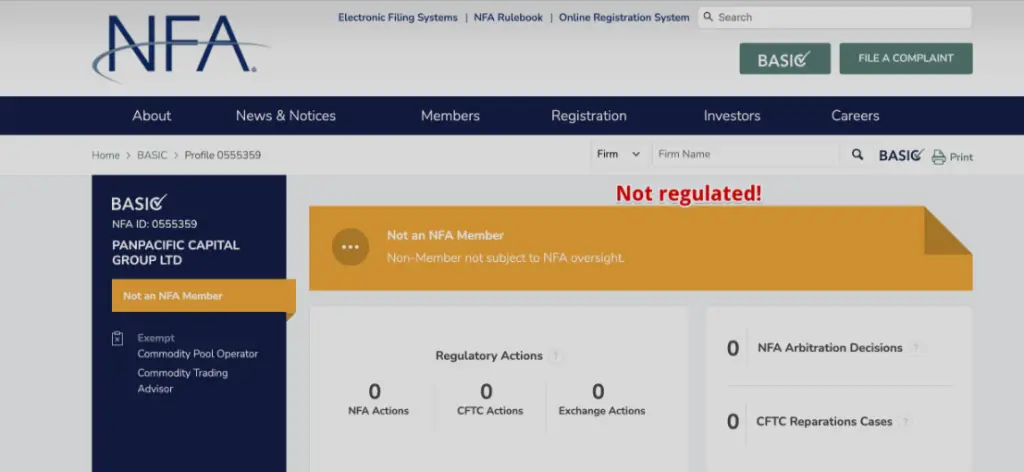 First of, Panpacific Capital Group presents an office address in the USA. Keep in mind, to operate as a forex broker in the United States, a company must be registered as a futures commission merchant and foreign exchange dealer with the Commodity Futures Trading Commission (CFTC) and to be a member of the NFA. Sadly, this broker is not licensed in the State.