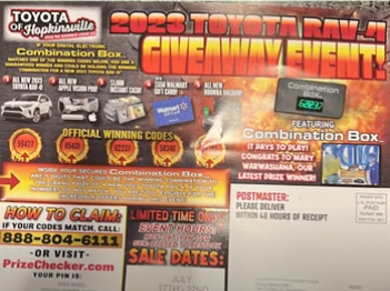 People are receiving the Prizechecker.com card in the mail from from Toyota, Chevrolet, Ford or other car dealership from their areas and they want to know if it is scam or legit. Some of the cards have a key to scratch while some comes with a combination box. However all the cards have a lucky winning number, so if you win dont be too too excites, everyone is winning with these Prizechecker cards. Also the cards have links to the prizechecker.com website and phone number where you are asked to input details so as to know the prize you won. But this is where you should be at alert. You should think twice before going to any Car dealership for any prize, because when you get there they might just give you a discount or a $5 gift card. You should also be ready to listen to a sales pitch as this is just part of a marketing campaign.