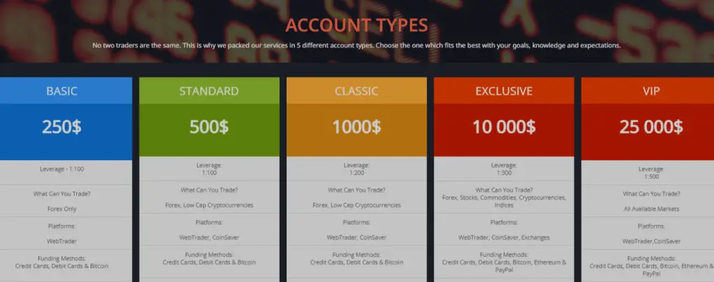 The broker claims to offer several funding methods – credit cards, debit cards, Bitcoin, Ethereum and PayPal.