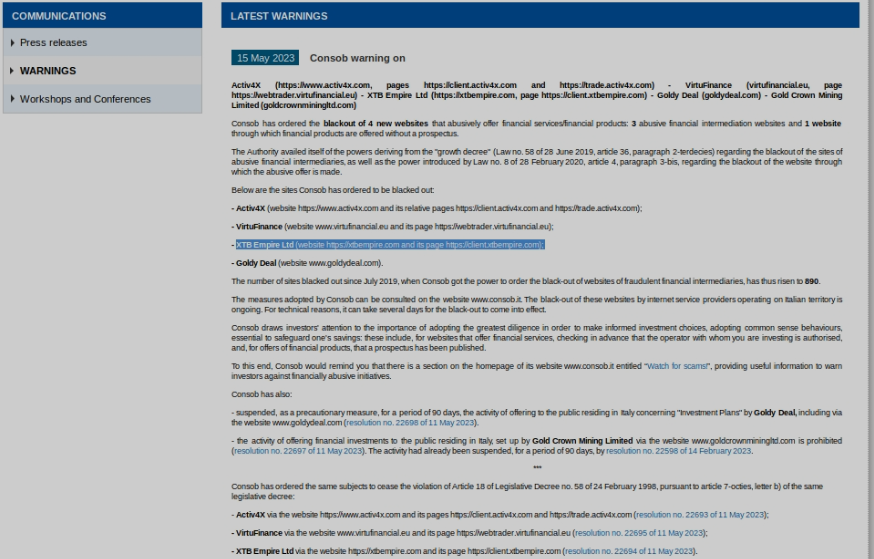 Having said that, it is not far from believing that xtbempire.com is not a licensed brokerage firm. It is not under any financial regulation which means wiring your money for trading is risky. Its unlicensed and unregulated activities are truly a red flag and must be avoided.