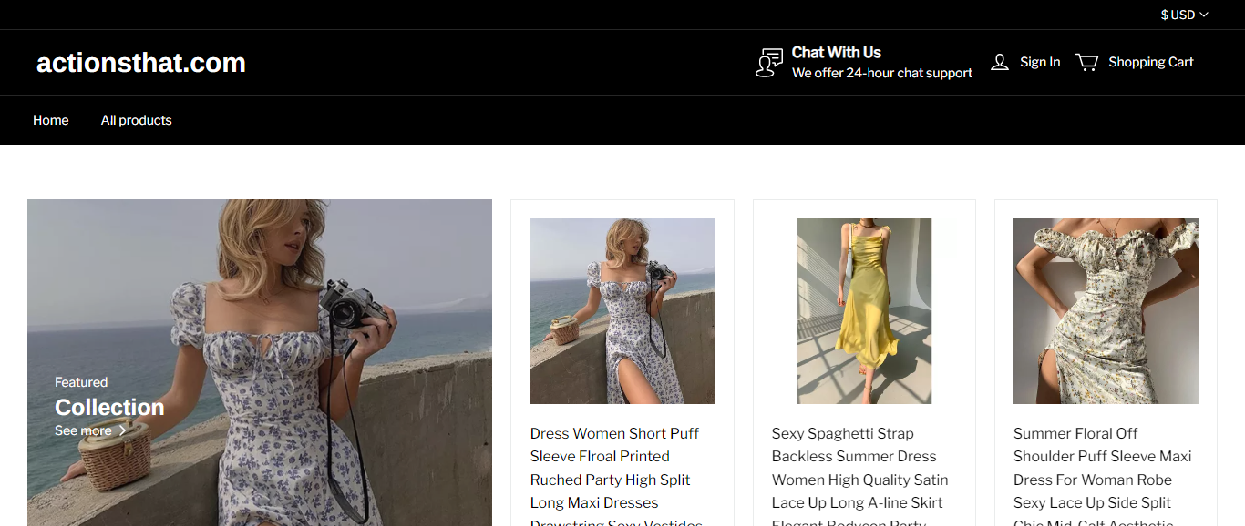 Actionsthat located at Actionsthat.com is an online store that is running ads from a fake Facebook page advertising Amazon pallets at very low prices. It also claims to be selling various fashion and clothing items such as dresses, lounge wear track suit, beach dresses, etc. And these products are sold at a suspicious discount rate.