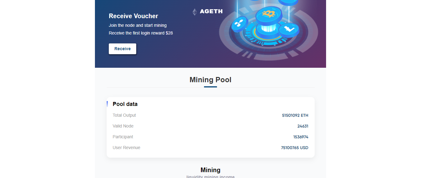 Ageth is an crypto mining platform. It claims that you can join the node and start mining after which you would receive a first log in reward of $28.