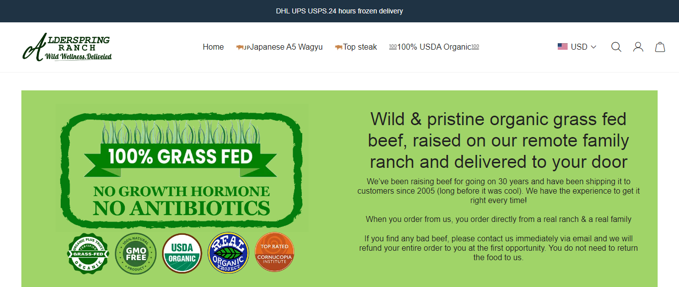 Alderspringranch located at Alderspringranch.com is impersonating The Alderspring Brand. It claims to be selling various livestock’s such as beef, burger patties, strip streak, etc. And these products are sold at a suspicious discount rate.