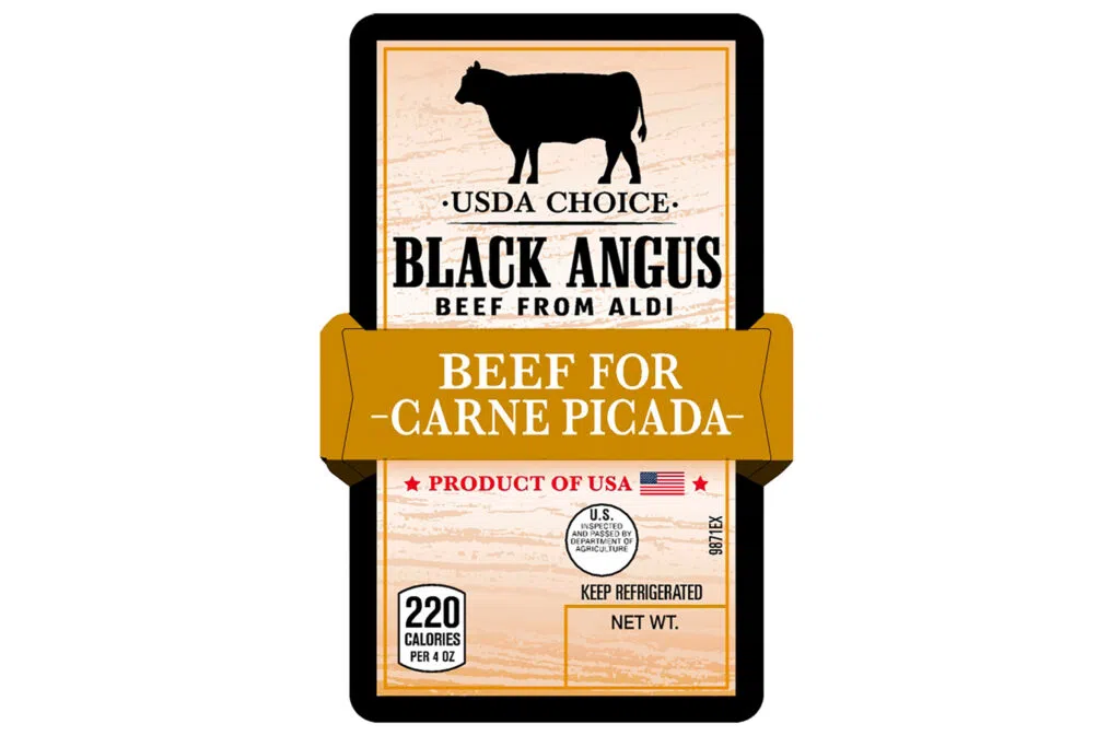 It applies to 1.5-pound plastic tray packages containing “USDA Choice Black Angus Beef From ALDI, Beef for Carne Picada” with a use- or freeze-by date of Aug. 22, 2023, Julian date 206 and time stamp between 08:43 and 09:23.