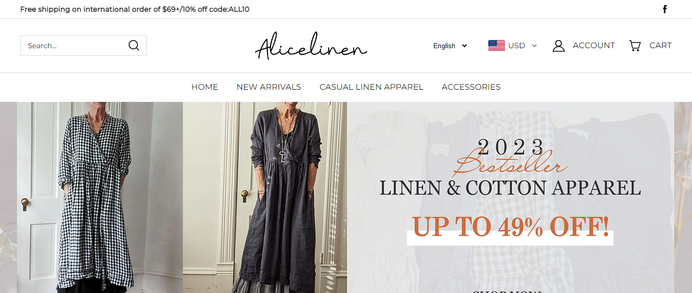 Alicelinen also known as Alice linen located at Alicelinen.com is an online store that is selling various products such as apron, maxi dress, long sleeve blouse, two piece, etc. And these products are sold at a suspicious discount rate.