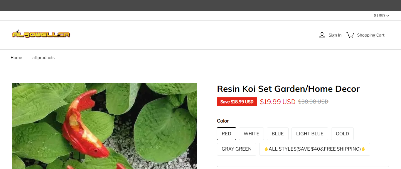Alsowellca located at Alsowellca.com is an online store that is selling various products such as Resin koi set, home, garden decor, statue, etc. It also claims to be selling boots via a Facebook ad. And these products are sold at a suspicious discount rate.