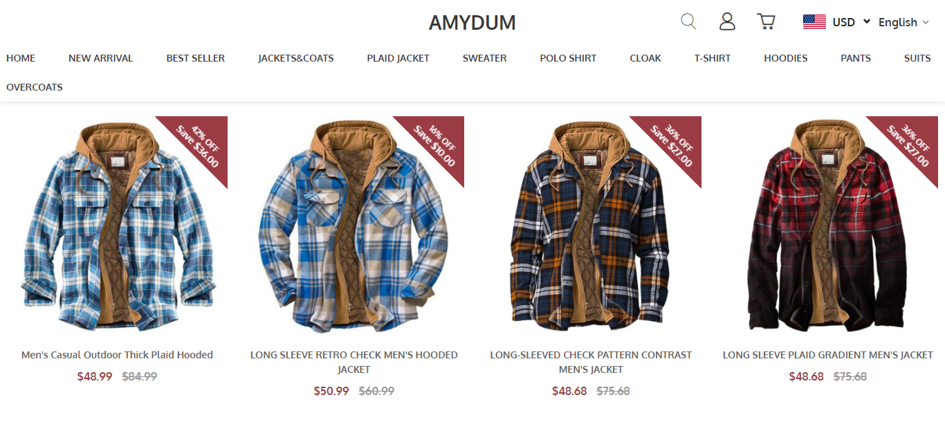 Amydum located at amydum.com is an online store that deals in various products such as jackets and coats, plaid jackets, sweaters, polo shirts, cloak, t-shirts, hoodies, pants, suits, overcoats, etc. And these products are being sold at suspicious discount prices.