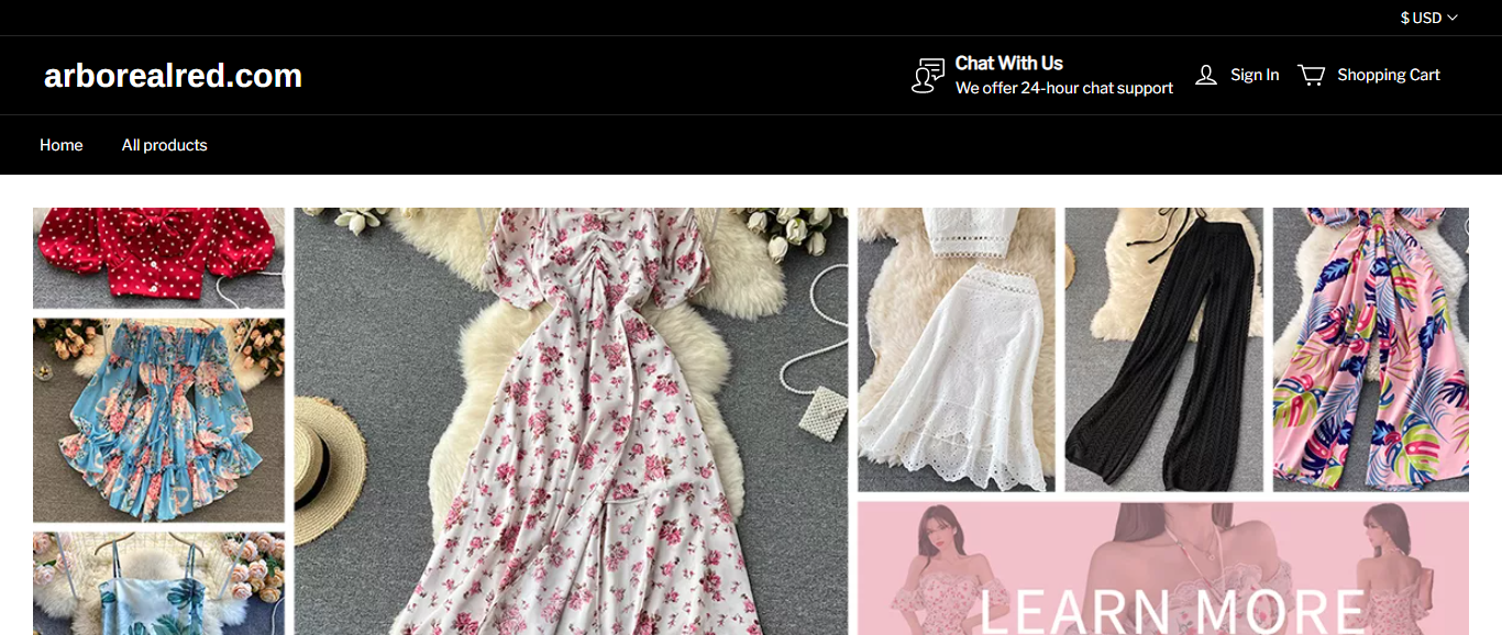 Arborealred located at Arborealred.com is an online store that claims to sell Amazon Pallets for only $29.9. It is also selling various types of clothing’s such as dresses, sandals, etc. And these products are sold at a suspicious discount rate.
