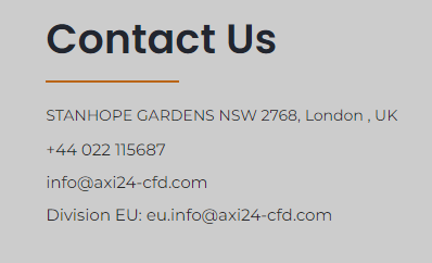 First of, Axi24-cfd.com claims its based in UK. However, nowhere is the name of this company mentioned. We were not surprised when the broker’s Terms and Conditions do not inform us which legal entity.