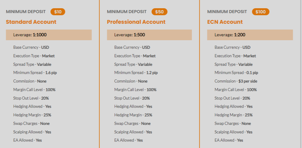 Axipip offers variety of trading account for clients. According to the account descriptions, the broker offers a leverage max 1:1000 and spreads from 1.6 pips.
