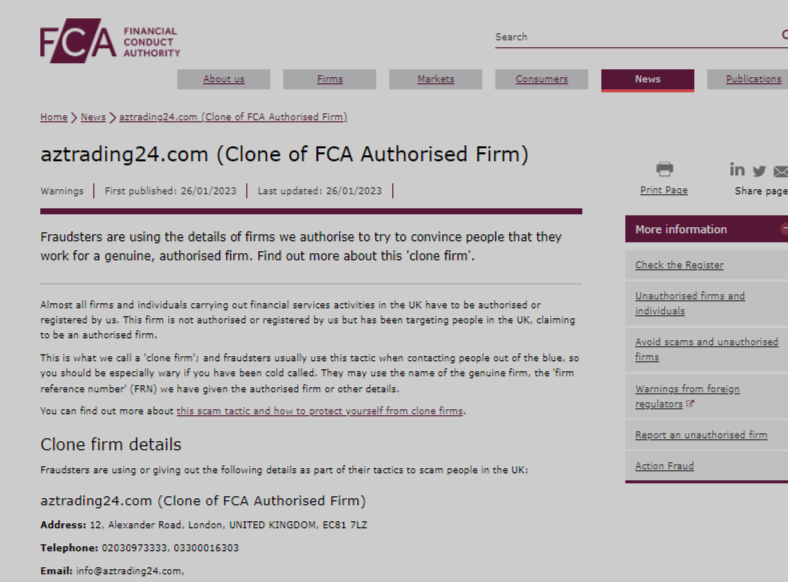A quick check on the broker, the official FCA warning that we dug up, meaning that AZTrading24.com is a clone of an authorized firm. See yourself —