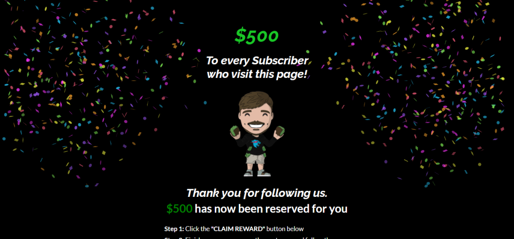 The grammar on the page is incorrect and the title is just “US Giveaway,”. When you visit the page, you can see a picture of Mr Beast welcoming you to the website, it then goes ahead to list steps you have to take in order to claim the $500 reward. These steps include: