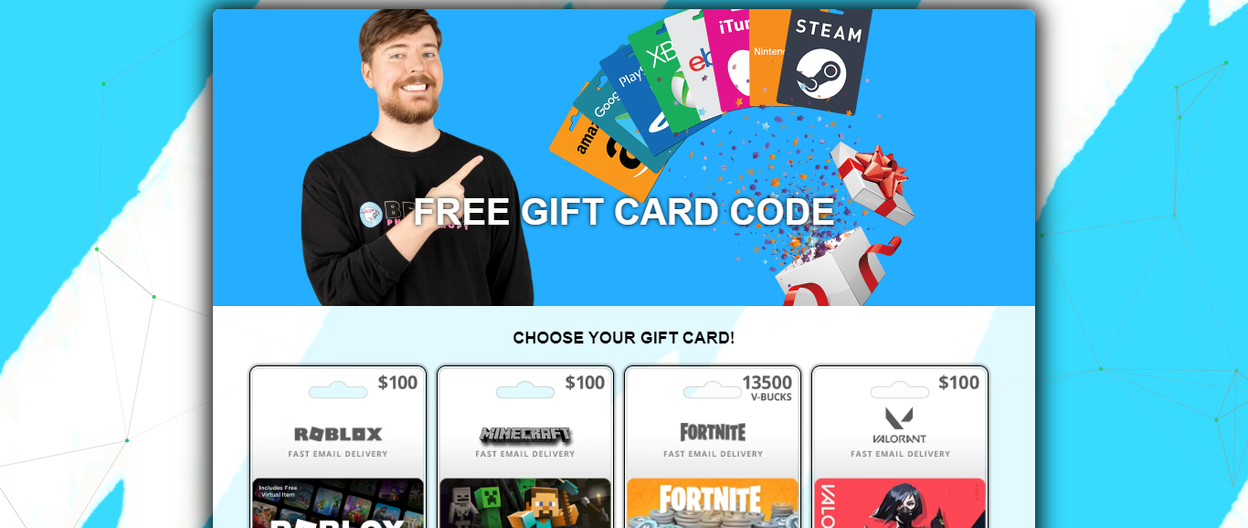 The Beastsgift.com is claiming to be the Mr Beast page and promising to give out $1000 to every subscriber who visits the page. It also claims to be giving out a free gift card code.
