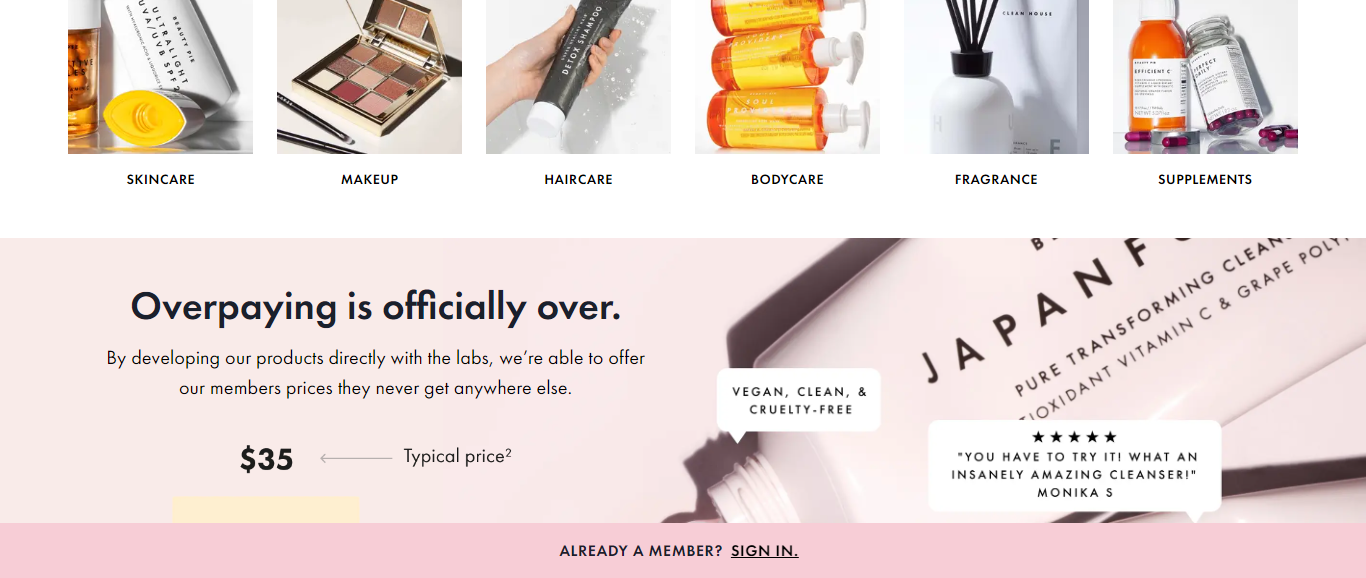 Beauty Pie is a cosmetics brand selling a variety of skincare and make up products such as haircare, body care, fragrance, supplements, make up,etc.