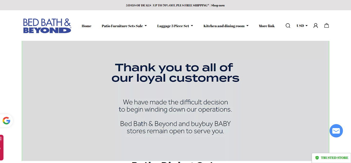 Betteronsite located at Betteronsite.com is an online store that is impersonating the Bed, Bath and Beyond Brand by using its brand name and logo as its own, It claims to be selling various products such as patio furniture sets, luggages, ottoman etc And these products are sold at a suspicious discount rate.