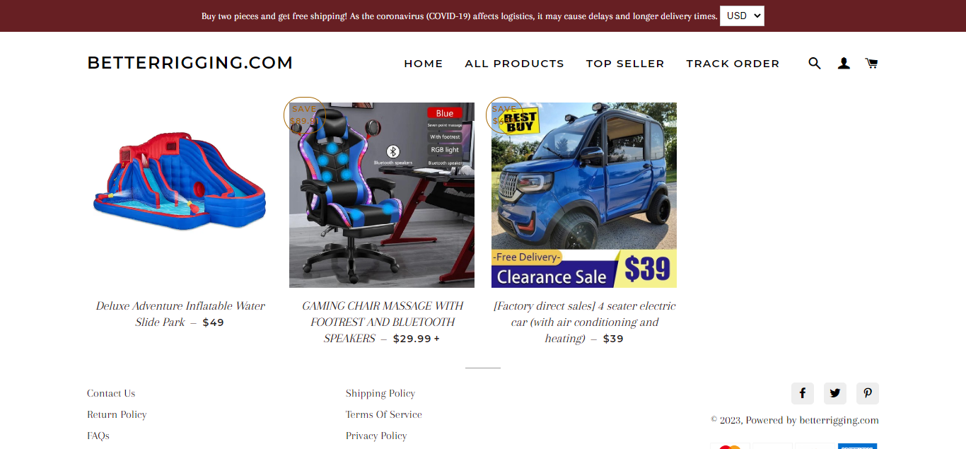 Betterrigging located at Betterrigging.com is an online store that is selling various products such as inflatable water slide park, 4 seater electric car, etc And these products are sold at a suspicious discount rate.