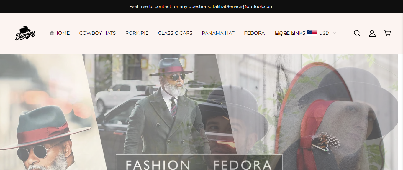 Boorjoy located at Boorjoy.com is an online store that is selling various products such as fedora hats, Panama hats, cowboy hats, etc And these products are sold at a suspicious discount rate.