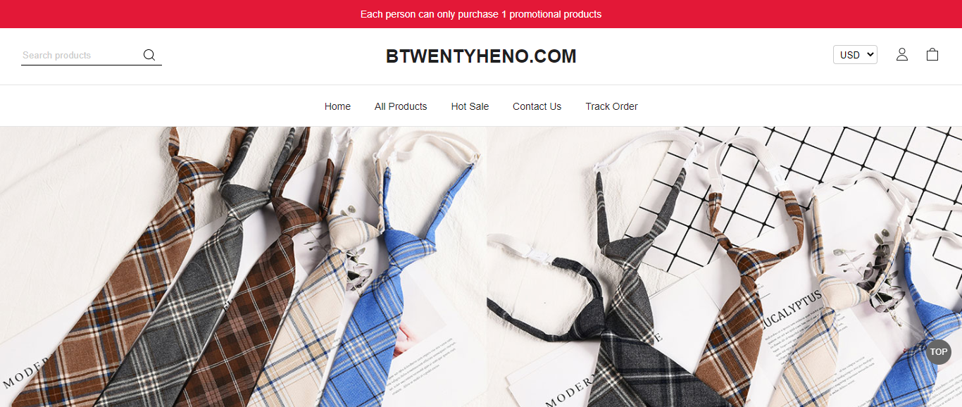 Btwentyheno located at Btwentyheno.com is an online store that is selling various types of ties, etc. And these products are sold at a suspicious discount rate.