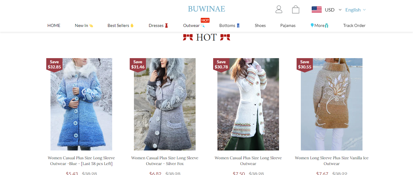 Buwinae located at Buwinae.com is an online store that is selling various fashion and clothing products such as outwears, dresses, sweater, etc. And these products are sold at a suspicious discount rate.
