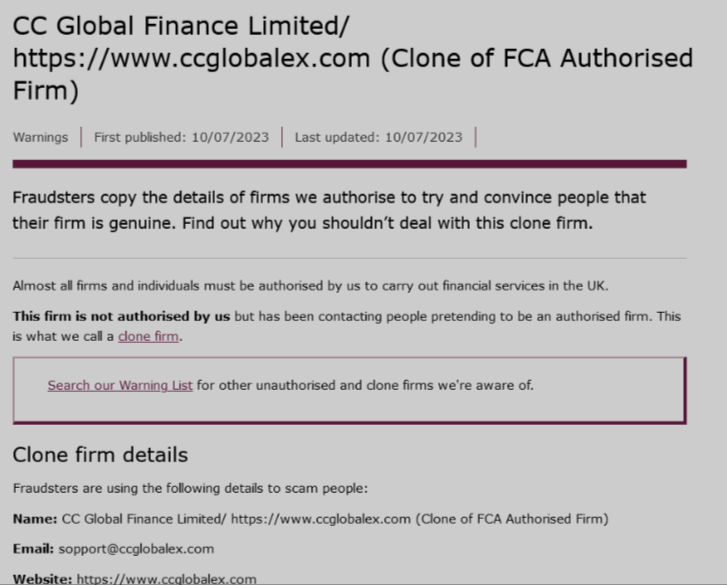 Furthermore, the home page claims that this broker was established in London, but at the same time is overseen by US authorities. A check shows that not only is CC Global Finance Limited not a licensed broker, but it has been blacklisted by multiple financial regulators, including those in the UK and Spain.