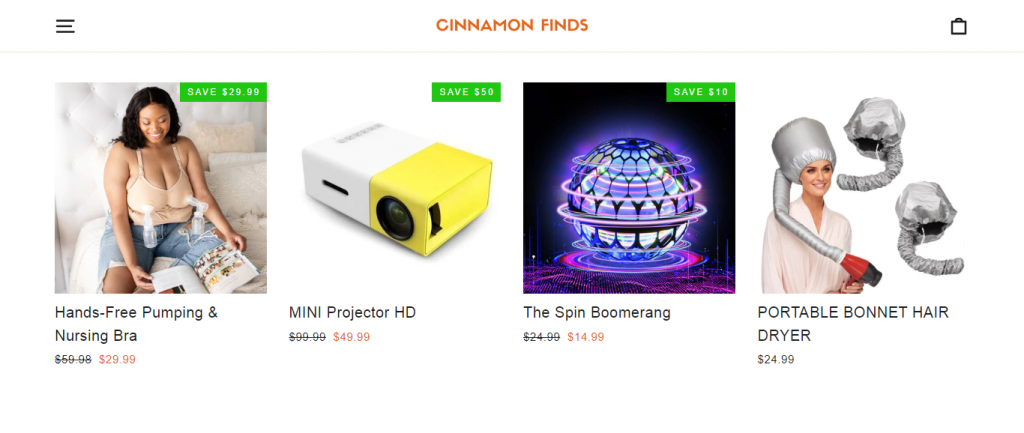 Cinnamonfinds located at Cinnamonfinds.com is an online store that is selling various products such as mini projector, portable bonnet hair dryer, hands free pumping and nursing bra, etc. And these products are sold at a suspicious discount rate.