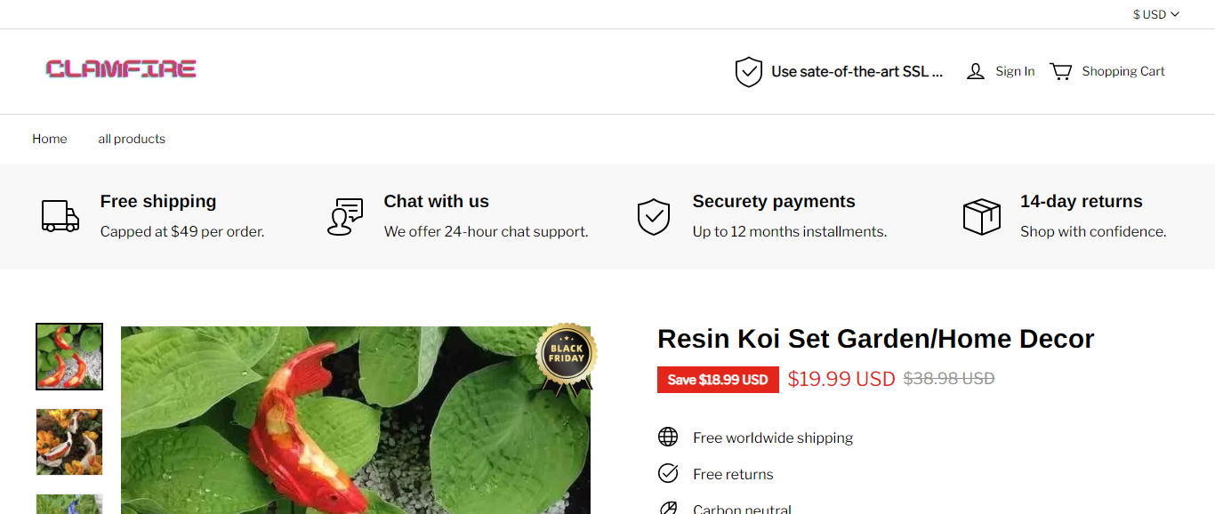 Clamfire located at Clamfire.com is an online store that is selling various products such as Resin Koi Set Garden decor, Resin parrot bird statue, etc. And these products are sold at a suspicious discount rate.