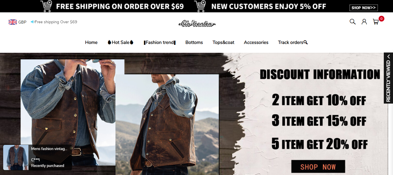 Clotcenter located at clotcenter.com is an online store that is selling various fashion and clothing products such as coats, tops, jackets, vests, bottoms, accessories, leather vest, cowboy vests, etc. And these products are being sold at suspicious discount prices.
