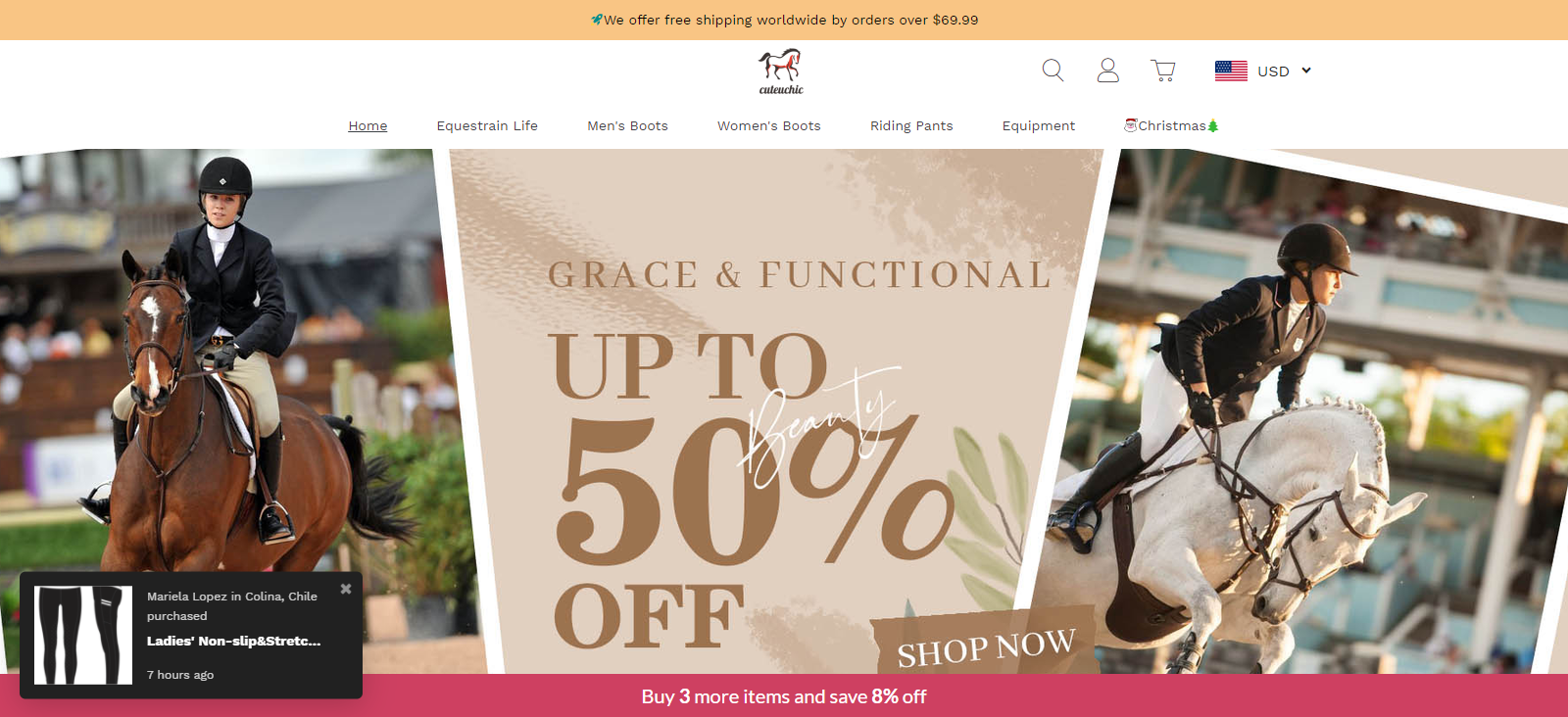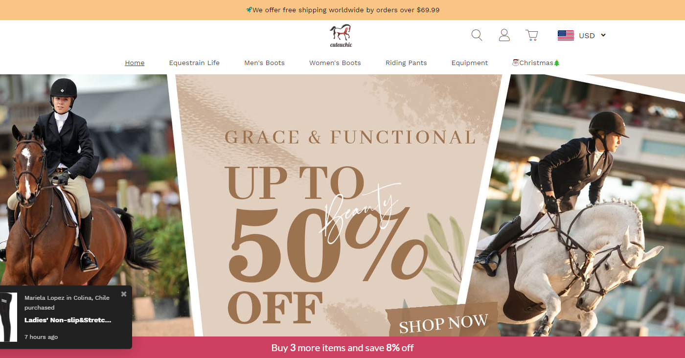 Cutechic.com is an online store that sells variety of colorful trendy female boots, breeches, riding pants, e.t.c. This store claims the reason why items are sold for cheap prices here is because they are offering Christmas sales. The products on the store include; men boots, women boots, riding pants, equestrian life clothes, e.t.c