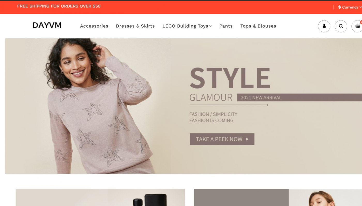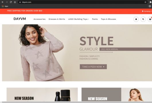 Dayvm.com is an online store that claims to be selling different kinds LEGO building toys and pieces, women’s outfits, tops and blouses, etc. The website is not structured very well and it misses some elements of a professional online store. It is less than two months old and as such, thus has a low trust score (You can check this using WHOIS Domain Age Checker).