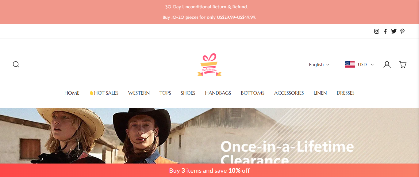 Defaliation located at Defaliation.com is an online store that is selling various fashion and clothing products such as tops, shoes, handbags, accessories, etc. And these products are sold at a suspicious discount rate.