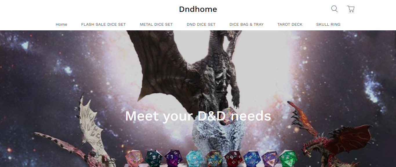 Dndhome located at Dndhome.shop is an online store that claims to be selling various products such as carved pattern dice, galactic space dice, handmade dice tray, etc. And these products are being sold at suspicious discount prices.