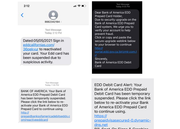 - Text messages asking people to reactivate a card by clicking a link are scams. Bank of America and EDD never text message people to reactivate a debit card.
