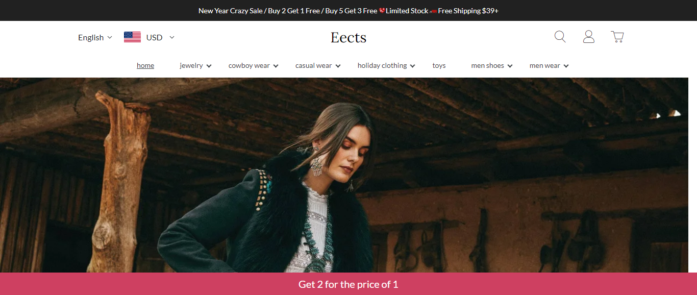 Eectrau located at Eectrau.com is an online store that is selling various fashion and clothing products such as cowboy boots, necklaces, earrings, coat, jackets, etc. And these products are sold at a suspicious discount rate.