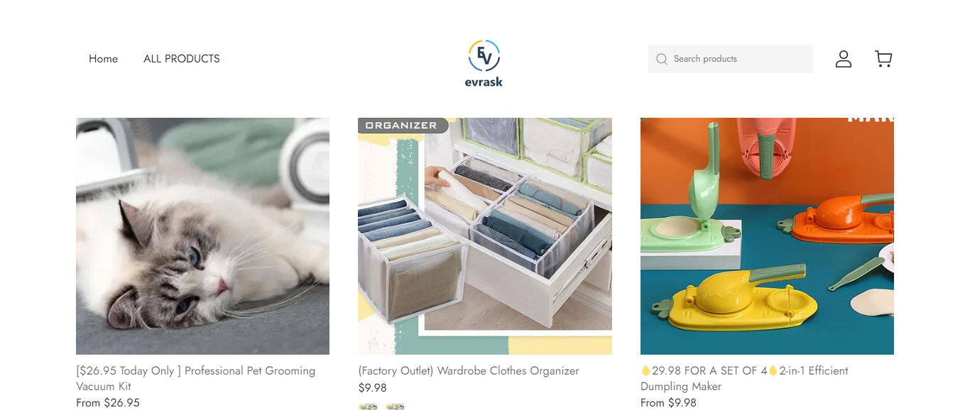 Evrask located at Evrask.shop is an online store that is selling various products such as pet grooming vacuum kit, wardrobe clothes organizer, efficient dumpling maker, etc. And these products are sold at a suspicious discount rate.