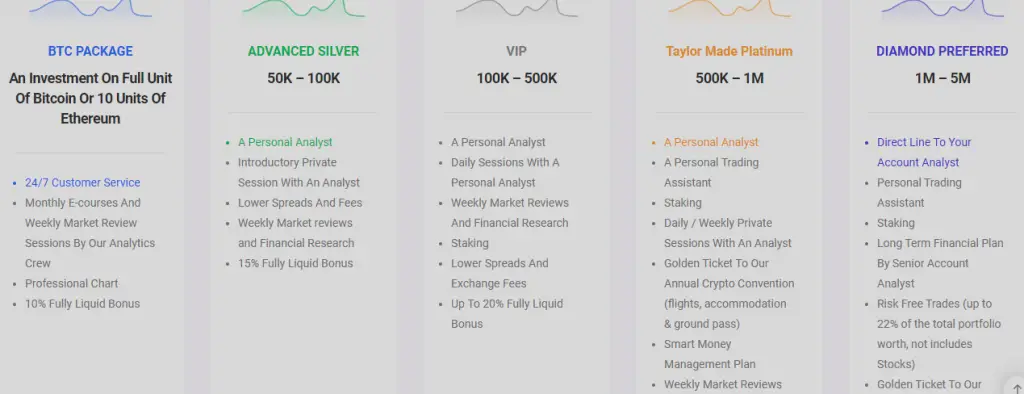 What is more, clients are offered various account packages like BTC PACKAGE, ADVANCED SILVER, VIP, TAYLOR MADE PLATINUM AND DIAMOND PREFERRED.