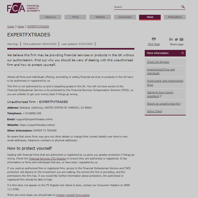 Obviously, the UK’s Financial Conduct Authority (FCA), the regulatory body in France, has taken resolute measures by issuing a warning regarding the broker’s fraudulent activities. The warning explicitly emphasizes that Expertfxtrade operates as an unlicensed entity.