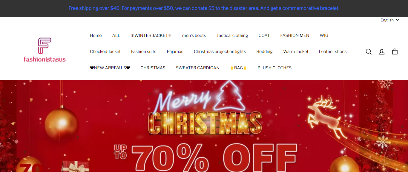 Fashionistasus located at Fashionistasus.com is an online store that is selling various products such as checked shirt, jacket, beddings, leather shoes, etc. And these products are sold at a suspicious discount rate.