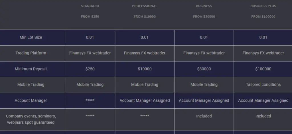 The broker FinansysFx FX has specified $250 as its minimum deposit based on its account type. In contrast, licensed FX brokers clearly spell out their regulations and license credibility with no string of fraud, and clients can start trading as low as $100 with the assurance of their trading funds.