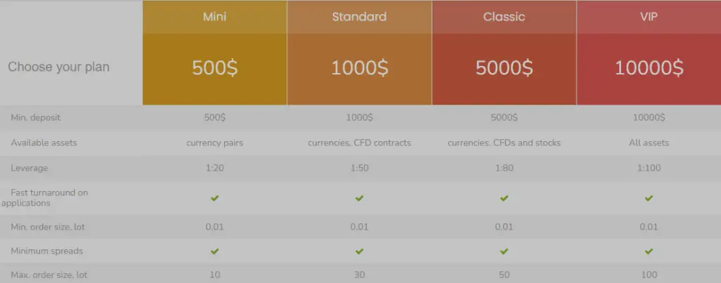 Fintegral offers different account types such as Mini, Standard, Classic and VIP. According to the account descriptions, the maximum leverage reaches 1:100.